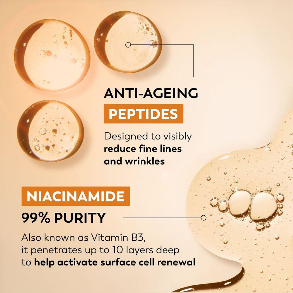النياسيناميد (فيتامين ب3)، الببتيدات الأمينية، الجلسرين، أصباغ خفيفة لتصحيح اللون، فيتامين هـ.