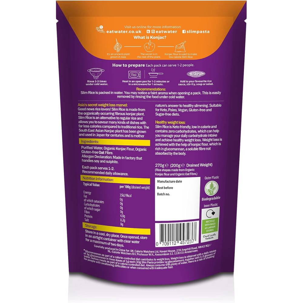 أرز إيت ووتر هو بديل صحي منخفض السعرات الحرارية للأرز التقليدي. يتميز بكونه خاليًا من الغلوتين والسكر، ويحتوي على ألياف طبيعية لدعم الهضم والشعور بالشبع لفترات أطول. مناسب للأشخاص الذين يتبعون نظامًا غذائيًا منخفض السعرات أو الكيتو أو النباتي.