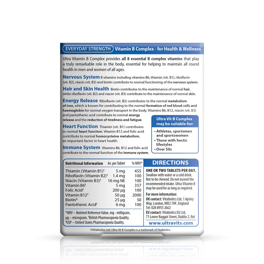 Ultra Vitamin B-Complex from Vitabiotics is a food supplement containing a full spectrum of effective B vitamins that help support energy levels and promote a healthy nervous system. This supplement contributes to overall well-being and helps combat tiredness and fatigue.