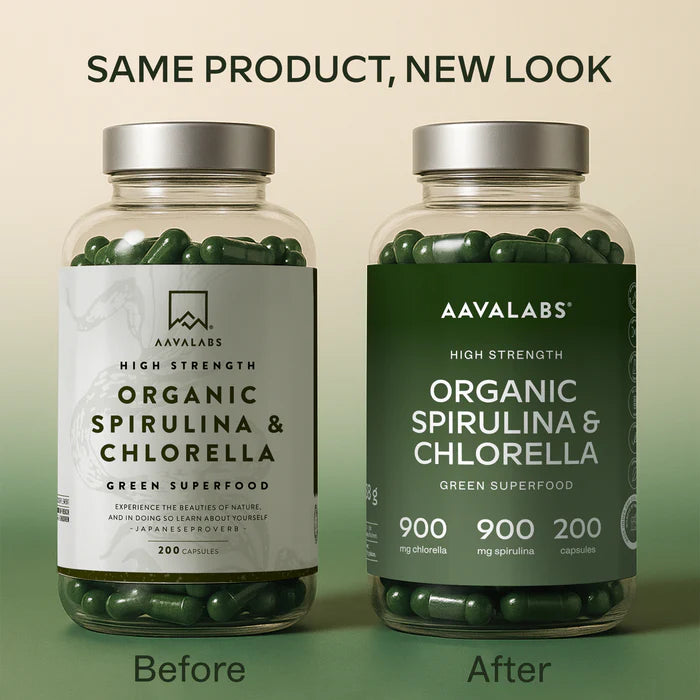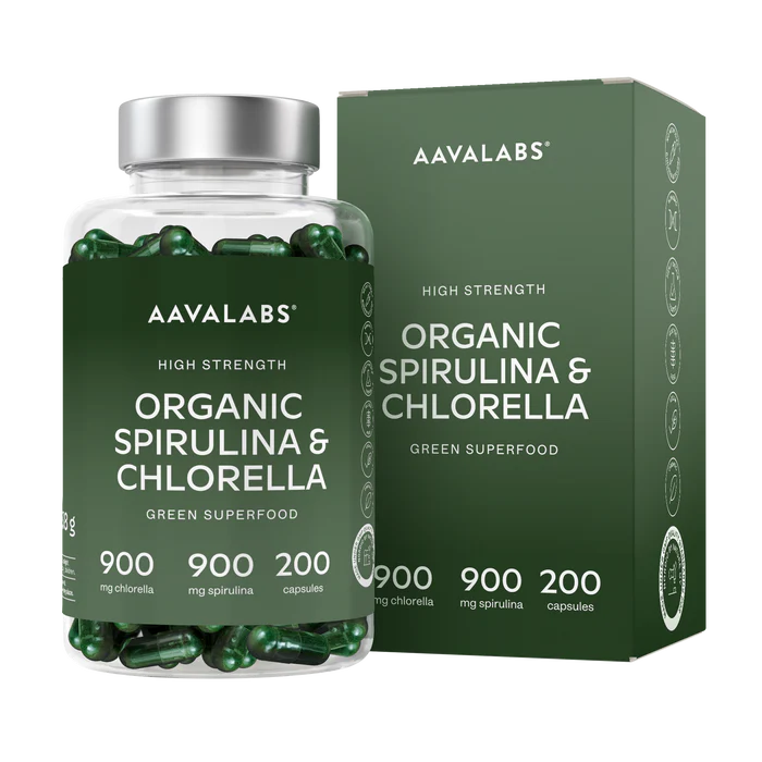AAVALABS Spirulina & Chlorella combines two premium plant-based ingredients in one convenient formula. Each capsule contains 50% organic spirulina and 50% organic chlorella, both known for their rich nutritional profiles, including natural proteins, vitamins, and minerals. Ideal for those seeking a clean and green addition to their daily diet.
